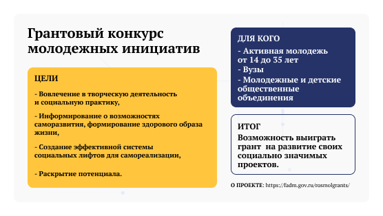 Этот конкурс проводится Росмолодежью и дает шанс выиграть грант на развитие своих проектов. В нем участвуют активные молодые люди в возрасте от 14 до 35 лет, вузы, молодежные и детские общественные объединения. Основная цель конкурса – это вовлечение молодежи в творческую деятельность и социальную практику, информирование о возможностях саморазвития, формирование здорового образа жизни и раскрытие потенциала молодежи, создание эффективной системы социальных лифтов для самореализации молодых людей.