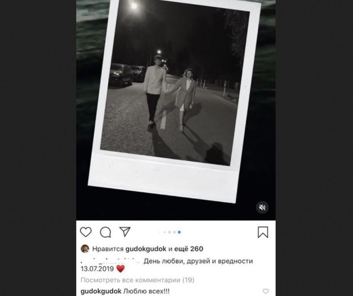 На снимках от 13 июля 2019 года Гудков что-то отмечал с друзьями, рядом была подруга в белом платье. "День любви, друзей и вредности", - гласила загадочная подпись под одним из фото.