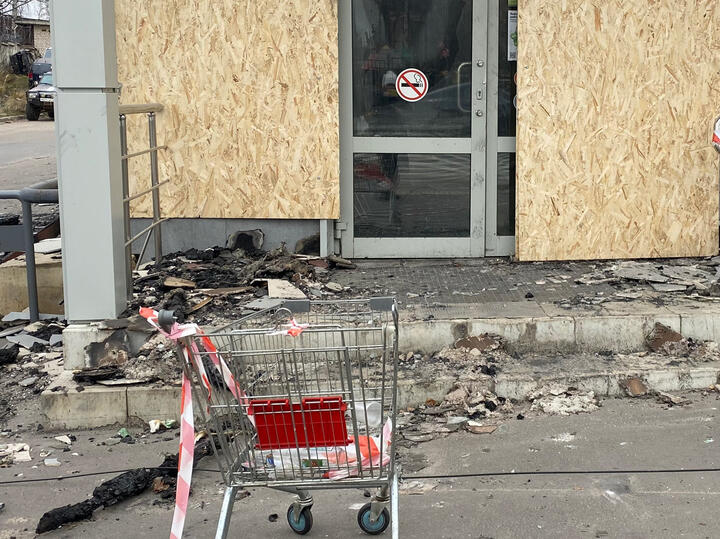 Помимо ночного клуба, в здании располагались супермаркет, аптека, цветочная лавка «Флора» и пивной бар. Около входа в супермаркет стоят три тележки. Рядом разбросаны бутылки из-под водки и пива. Кто-то оставил сумки с продуктами.