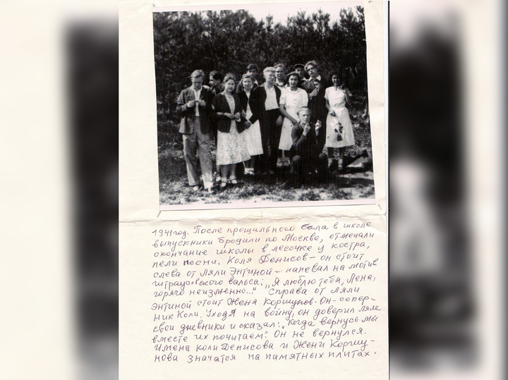 В июне 1941 года Люся сдала последний школьный экзамен. После выпускного бала они с одноклассниками до утра гуляли по Красной площади и Тверскому бульвару, нарядные, влюбленные, Женя Коршунов с Колей Денисовым — в «Ляльку» Энтину, Люся — в «ашника» Диму Сарабьянова, музыканта, поэта, легкоатлета. Люба Соловьева, Сонечка Кержнер, Милан Урбан…