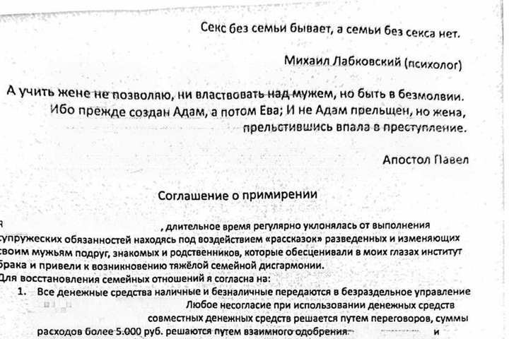 В суд муж принёс «соглашение о примирении». Хотя по факту оно больше всего похоже на инструкцию по покорности. В эпиграфе к своему "Домострою" у супружника значатся два столпа семейной мудрости. Первая – от Михаила Лабковского: "Секс без семьи бывает, а семьи без секса — нет". Вторая — от апостола Павла: "А учить жене не позволяю, ни властвовать над мужем, но быть в безмолвии. Ибо прежде создан Адам, а потом Ева. И не Адам прельщен, а жена, прельстившись, впала в преступление".