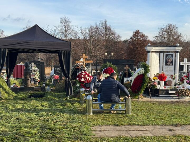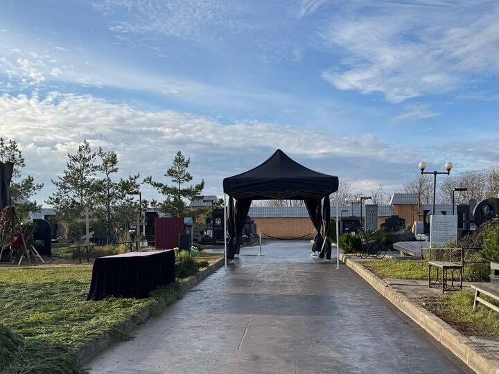Рядом с могилой телеведущего установили два траурных шатра.