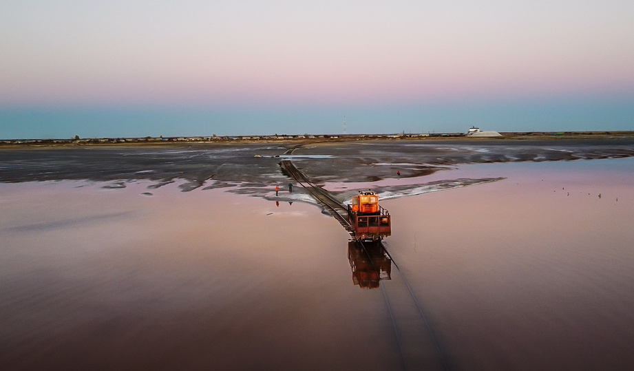 Вращающийся дисковый рыхлитель разрушает пласт соли глубиной в полметра. Добытую соль перемещают в элеватор, прямо на озере очищают от ила и ссыпают в вагоны. В каждый из четырех вагонов помещается около 18 тонн сырья. И груженый поезд по параллельному пути идет на берег.