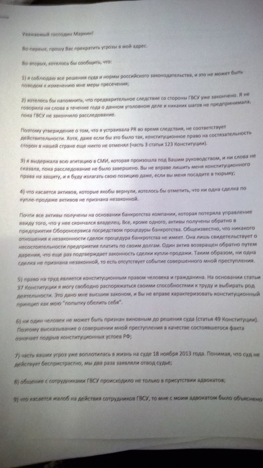 Далее Васильева напоминает Маркину, что «ни один человек не может быть признан виновным до решения суда», из-за чего «высказывания о совершении преступлений в качестве состоявшегося факта» она считает «подрывом конституционных устоев».