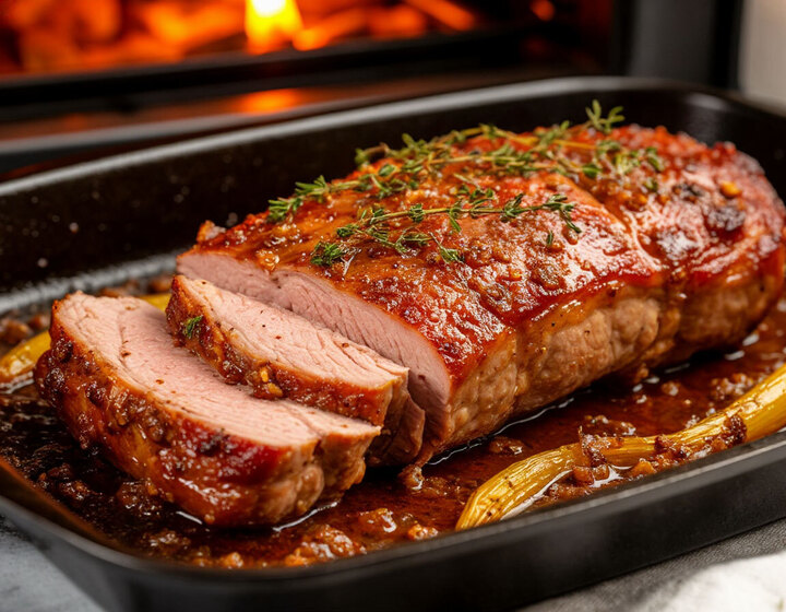 - Финишная корочка: достаньте буженину, увеличьте температуру духовки до максимума (250°C) и верните мясо обратно на 10–15 минут, чтобы образовалась хрустящая корочка.