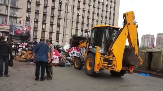 Военные батальона "Восток" и заявили о необходимости разобрать баррикады. Причиной этому, по их словам, стали участившиеся в городе случаи мародерства. До этого в городе был разграблен гипермаркет "Метро". За кадром один из бойцов комментирует происходящее и рассказывает про ситуацию в городе.