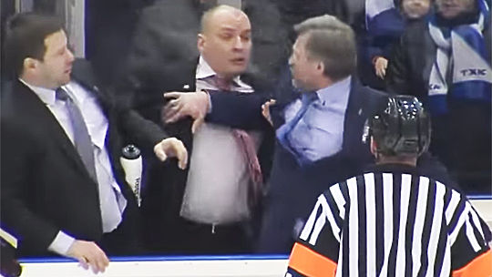 Скандал вспыхнул в третьем матче полуфинальной серии плей-офф ВХЛ ТХК - «Ижсталь», в котором подрались главные тренеры команд Алексей Ждахин и Андрей Разин. Видео: youtube.com/Говорящий в тишине