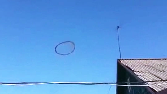 На выложенной в сеть любительской съемке запечатлено необычное явление в небе над Казахстаном. Появившееся на высоте примерно километра от земли черное кольцо медленно проплыло над домами и растворилось в воздухе. Видео: youtube.com/Вот это да