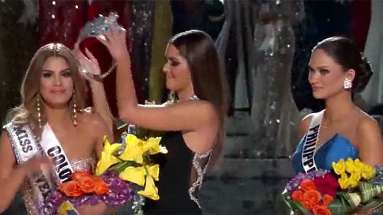 На конкурсе "Мисс Вселенная" произошел конфуз. Ведущий в прямом эфире вручил корону Мисс Колумбии, но затем опомнился и, извинившись, наградил почетным титулом филиппинку Пиа Алонсо Вуртцбах.