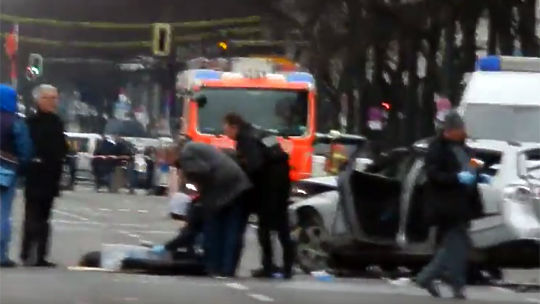 Видеокадры с места трагедии в Берлине, где сегодня прямо во время движения взорвался заминированный автомобиль. Водитель машины погиб. Видео опубликовано на сайте youtube.com пользователем Grebensikov Dmitrij.