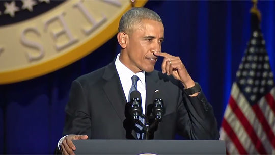 Во время прощальной речи перед нацией американского президента Барака Обаму начали душить слезы. Он столь сильно расчувствовался, благодаря свою семью за поддержку и заслуги перед Отечеством, что глаза его неоднократно увлажнялись. Видео опубликовано на сайте youtube.com пользователем Reflect.