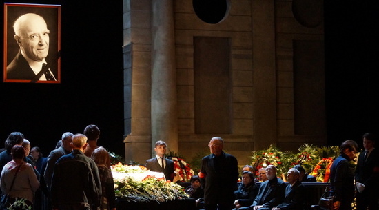 Утром во вторник, 12 марта, у театра Вахтангова собрались люди с цветами. Поклонники Владимира Этуша пришли проводить выдающегося актера в последний путь. Церемония прошла тихо, люди молча подходили и возлагали к гробу артиста бесконечные цветы. Микрофона на сцене театра не было, друзья, близкие и коллеги актера не произносили пафосных речей, тишину нарушала лишь грустная музыка и всхлипывания пришедших. Народный артист СССР Владимир Этуш скончался 9 марта в возрасте 96 лет.