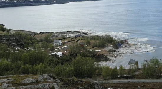 Огромный оползень унес в море восемь домов рыбацкой деревушки, стоящей на мысе Кракнес в Норвегии. Жители приезжают сюда только на выходные, и благодаря этому катастрофа обошлась без жертв - единственный обитатель деревни Ян Эгил Бэккеби успел выбежать из дома и подняться на ближайший холм, откуда и снимал на видео все происходящее.