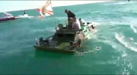 Одна из трех бронемашин, участвовавших в патриотической акции "Керченский десант", затонула во время форсирования пролива. Экипаж из пяти человек сняли с затонувшей машины спасатели. Как сообщил организатор акции, ЧП произошло из-за сильного течения и бокового ветра. Видео опубликовано на YouTube пользователем Южные дела.