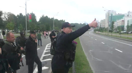 Александр Лукашенко вышел за ворота своей резиденции и поблагодарил силовиков: "Спасибо, вы красавцы!!!". С их стороны прозвучало: "Мы с вами до конца!". Один из сопровождающих Лукашенко смял воткнутый в клумбу бело-красный флажок. Видео опубликовано в Telegram-канале "Пул Первого".