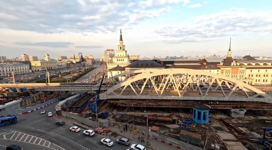 В Москве продолжается реконструкция железнодорожных диаметров. На площади Трех вокзалов только что установили на место новую арку железнодорожного путепровода, соединяющего сразу два диаметра МЦД. За 20 часов мостостроители группы «1520» передвинули 88-метровую конструкцию весом 1200 тонн.