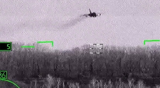 Опубликованы кадры контроля нанесения авиационного удара с самолета Су-24м по замаскированным укрепленным позициям ВСУ с предельно малой высоты. После маневра были отстрелены противоракетные тепловые ловушки.