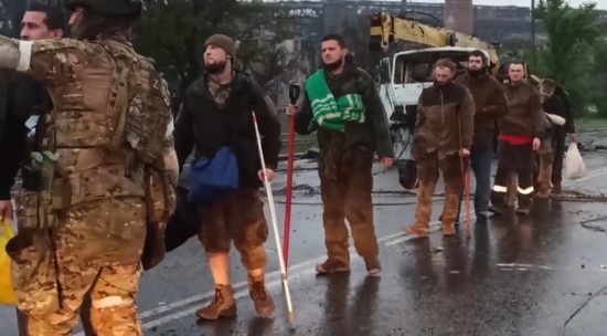 На видеозаписи видно, как пленные выходят с территории завода группами, направляются на пункт досмотра, а затем усаживаются в автобусы.