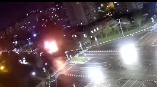 На опубликованном видео можно увидеть момент попадания снаряда рядом с проезжей частью и последовавший за этим взрыв. Сила детонирования снаряда была достаточной чтобы подбросить вверх припаркованные поблизости автомобили. По имеющимся данным, три человека ранены.