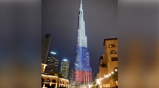 Самое высокое здание в мире, небоскреб Бурдж-Халифа в Дубае, окрасилось в цвета российского флага. "UAE stands in solidarity with Russia",- транслируется бегущей строкой на башне. Министерство иностранных дел Эмиратов заявило, что ОАЭ осудили теракт в "Крокус сити холле", выразив соболезнования семьям погибших, а также правительству и народу России.