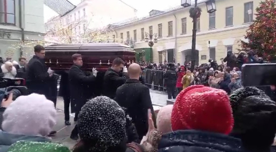 На улице в Камергерском переулке гроб с телом Евгении Добровольской ждали несколько сотен человек. Люди стояли с цветами в полной тишине, но когда начали выносить цветы, раздалась первая волна оваций. Это было трогательное мгновение, которое объединило всех собравшихся в одном порыве благодарности и скорби.