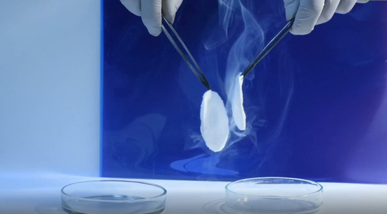 Зрелищный эксперимент демонстрирует химическое взаимодействие газов. Один ватный тампон пропитан раствором аммиака, а другой — соляной кислотой. Когда вещества начинают испаряться и встречаются в воздухе, то образуются мельчайшие кристаллы хлорида аммония (NH₄Cl), которые выглядят как дым.