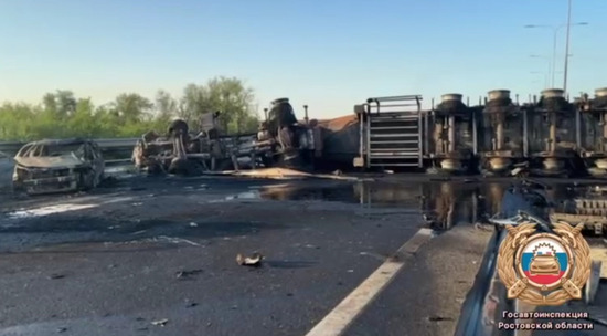 Смертельное ДТП произошло на трассе М4 "Дон" в ночь на вторник под Ростовом-на-Дону. Водитель цистерны-бензовоза врезался в отбойник, машина развернулась поперек дороги и столкнулась на встречке с двумя легковыми авто и микроавтобусом. Опрокинувшаяся цистерна загорелась и взорвалась. В ДТП погибли четыре человека (среди них один ребенок) и шестеро пострадавших доставлены в больницу. Видео с места ЧП опубликовала Госавтоинспекция Ростовской области.
